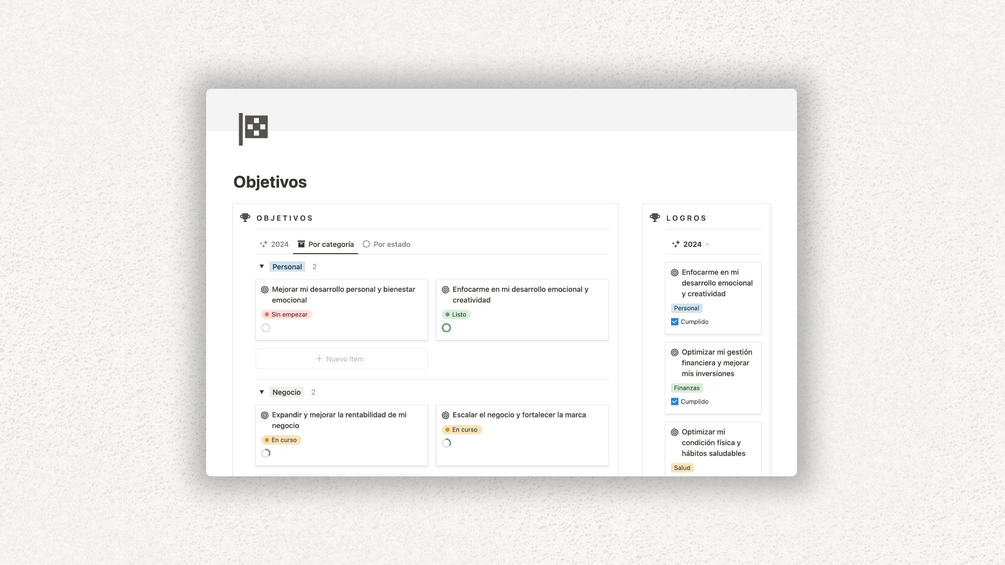 - Sección de objetivos: Clasifica tus metas por categoría (personal, negocio, salud, estudios, finanzas) o por estado de avance (pendiente, en progreso, completado). Esto te permitirá priorizar y visualizar tu progreso fácilmente.